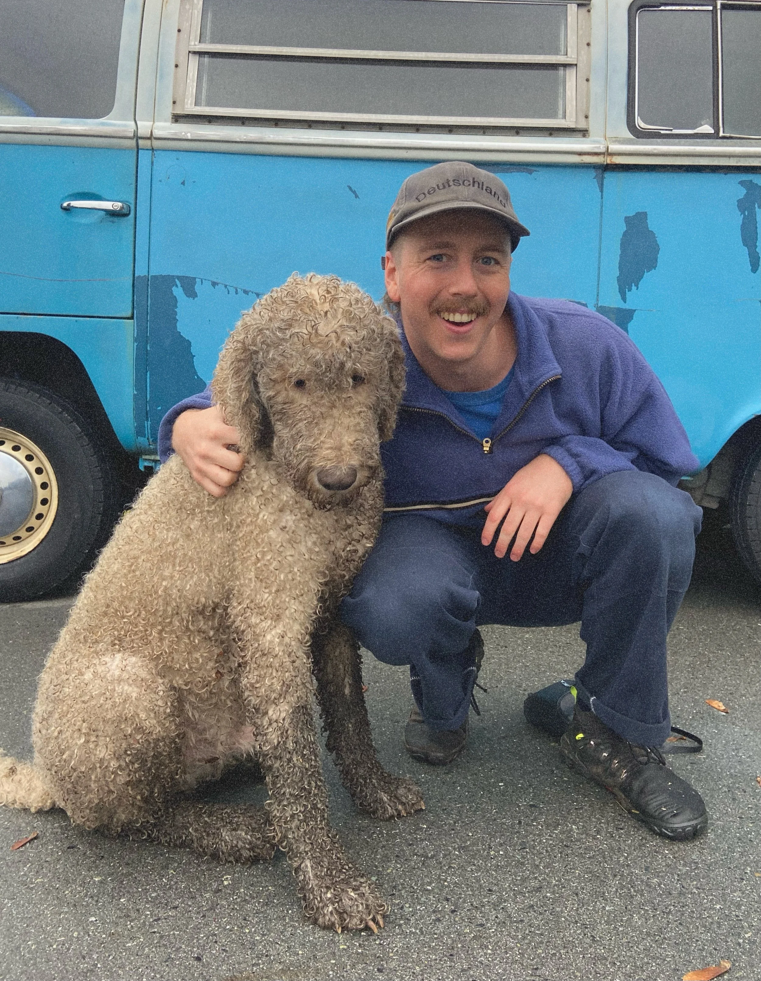 I will be impossible to miss. look for the man with a moustache wearing a blue loon fleece driving a blue vw bus with a humorously curly white-not-blue dog named OsCar ~~~~ *the smell of cheese fills the air* ~~~~